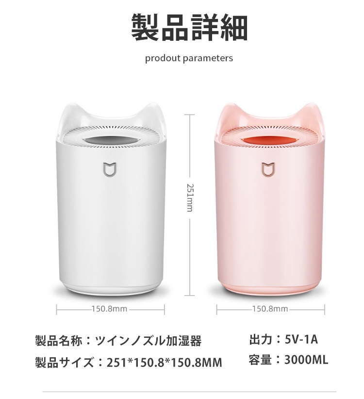 大容量ツインノズル加湿器 大容量 ツインノズルデザイン エンクロージャーライト 静音モード搭載